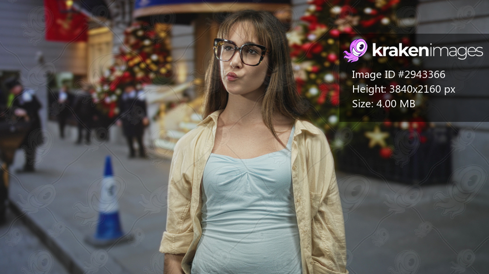 Woman wearing glasses and light blue tank top purses lips while standing by a decorated christmas tree on a city street; playful confidence.