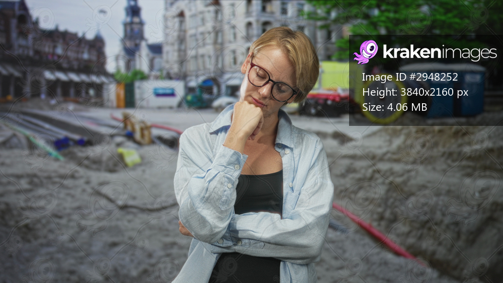 Woman wearing glasses and light shirt, hand on chin, standing before an urban excavation trench with cables and portable toilets on a street construction site; contemplation. - Kraken Images