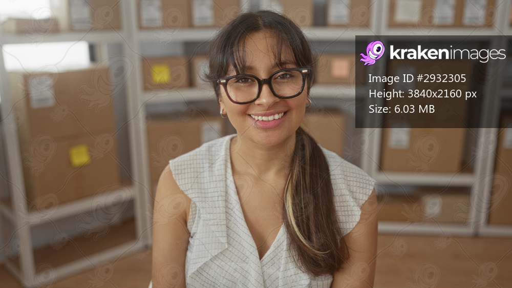 Woman wearing glasses with lip piercing and ponytail seated among stacked cardboard parcels on warehouse shelves in a building; small business confidence entrepreneurship. - Kraken Images