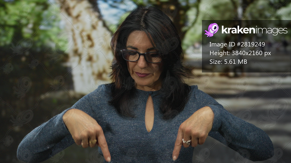 Woman wearing glasses and long sleeve blue top pointing fingers downward at ground in green park; alertness.