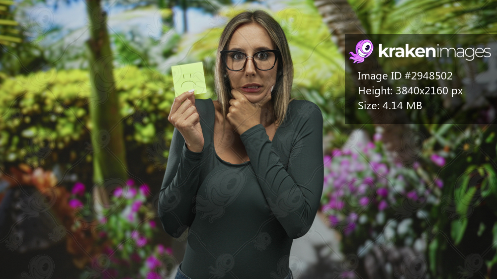 Woman wearing glasses and longsleeve shirt holding a note with sad face and hand on chin in forest; uncertainty thinking.