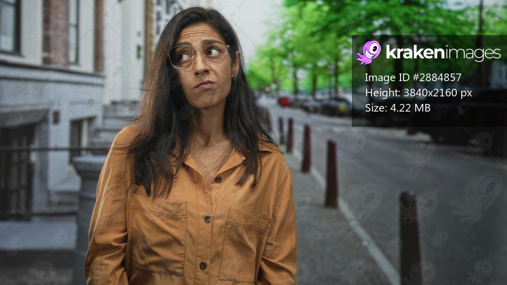 Woman wearing glasses looks up with a raised eyebrow on a city street lined with trees and parked cars; uncertainty hesitation.