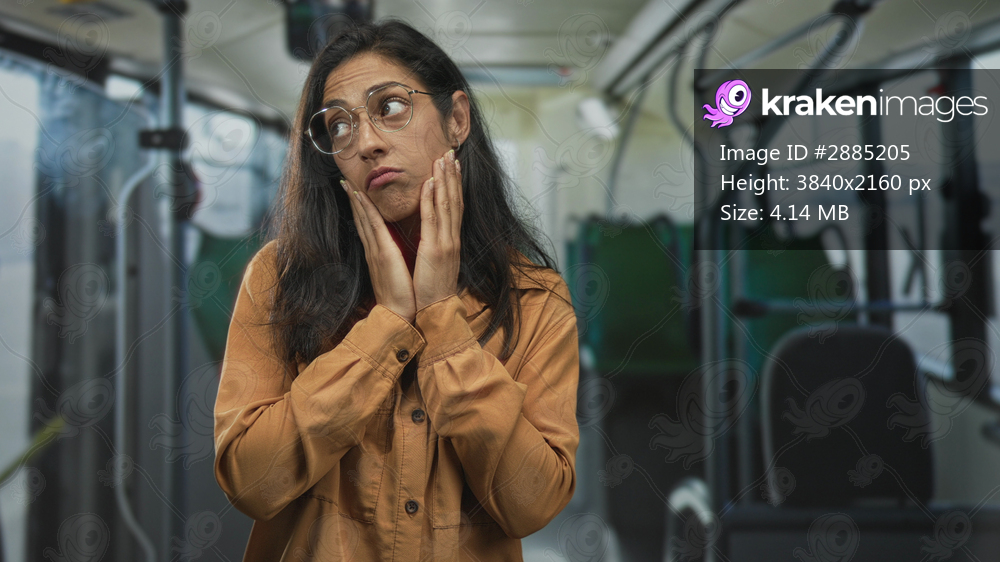Woman wearing glasses and orange shirt with hands on cheeks touching her face inside a bus on a street, visible hand gesture and thoughtful expression; worry uncertainty. - Kraken Images