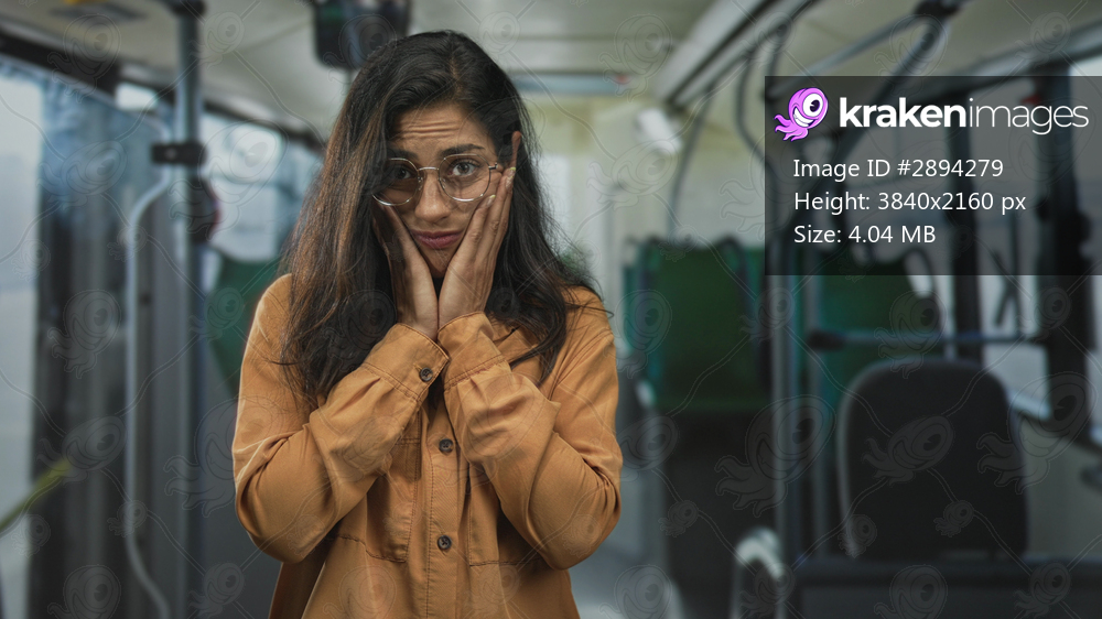 Woman wearing glasses and orange shirt with hands on cheeks touching her face inside a bus on a street, visible hand gesture and thoughtful expression; worry uncertainty. - Kraken Images