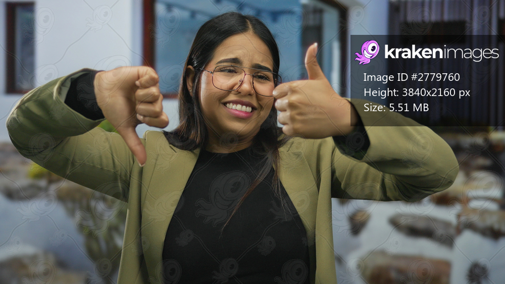 Woman wearing glasses outdoors gives thumbs up and down in an ambiguous gesture, showcasing uncertainty and mixed emotions in her expression.