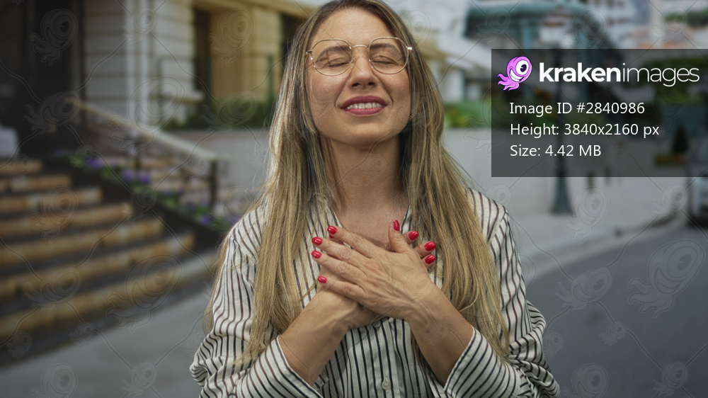 Woman wearing glasses places hand on chest on city street beside stone building, smiling warmly; gratitude.