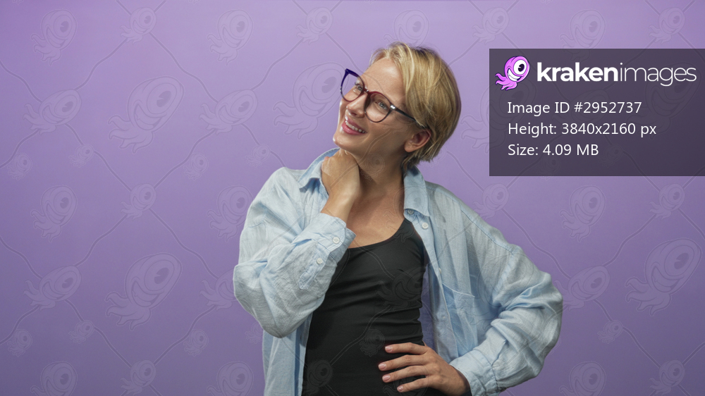 Woman wearing glasses places right hand on neck and left hand on hip in studio portrait against purple seamless backdrop; contentment.