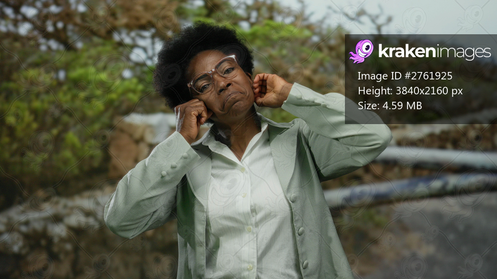 Woman wearing glasses plugs ears and makes a face in an outdoor park with trees, conveying frustration and a playful mood.