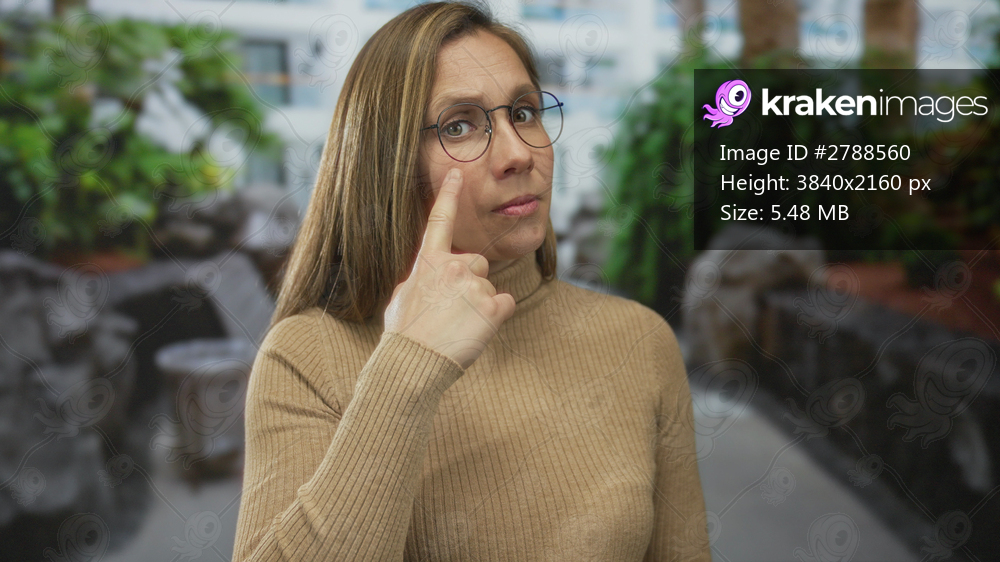 Woman wearing glasses pointing at her face while standing outdoors surrounded by greenery and urban architecture.