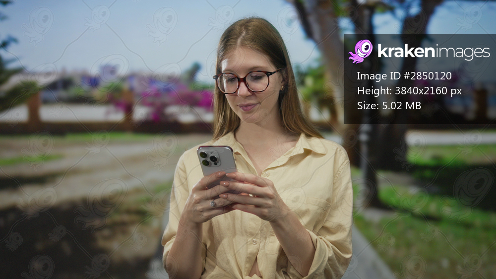 Woman wearing glasses pointing finger to smartphone on a tree lined park path; digital discovery curiosity engagement.