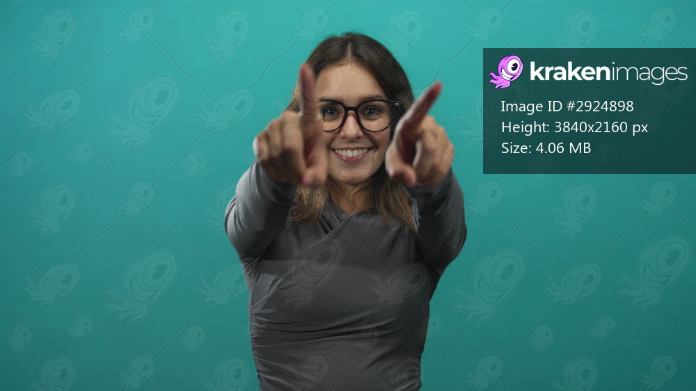 Woman wearing glasses points both index fingers toward camera in studio with teal background; playful invitation.