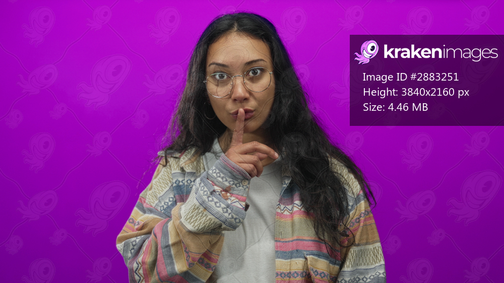 Woman wearing glasses points finger then places finger to lips for silence in studio with purple backdrop; secrecy hush.