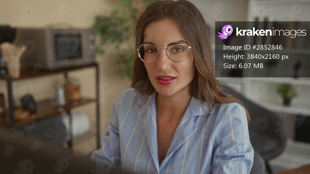 Woman wearing glasses points finger to screen on desk in office building; focus determination productivity ambition.
