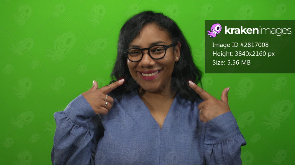 Woman wearing glasses points fingers to cheeks in green studio with head tilt; happiness confidence positivity.