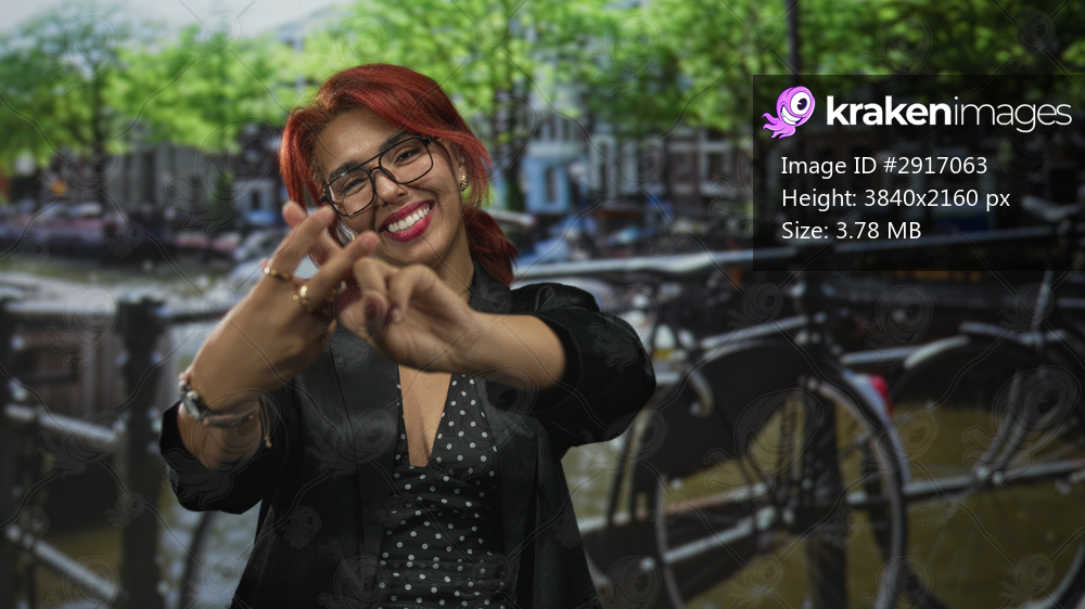 Woman wearing glasses and polka dot dress, hands extended pointing and crossing fingers in a street by an amsterdam canal with bicycles and railing; joy connection. - Kraken Images