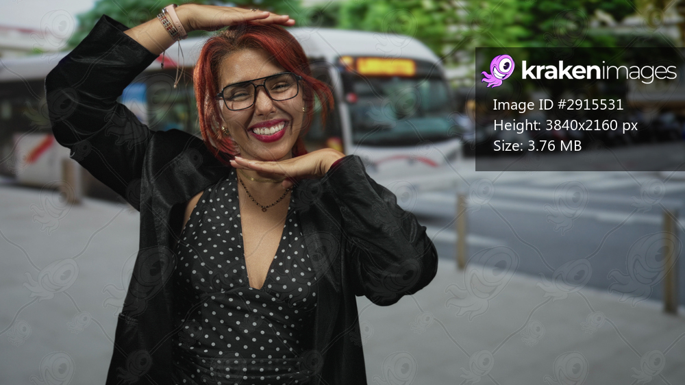 Woman wearing glasses and polka dot dress, hands framing face while smiling broadly on a street with a bus and trees; joy city life.