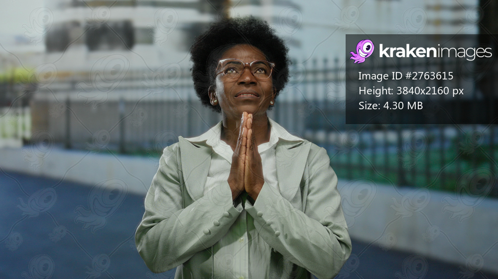 Woman wearing glasses praying outdoors in city street with a thoughtful expression against an urban fence background