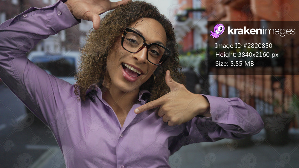 Woman wearing glasses and purple shirt makes framing gesture with fingers and smiles broadly on city street; joy.