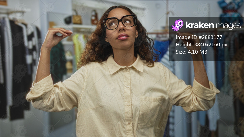 Woman wearing glasses raises hands and looks up in a building shop with clothing racks and a mirror; indecision shopping choice reflection.