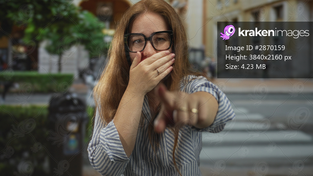 Woman wearing glasses raises hands with palms up in busy city street with crosswalk and pedestrians; happiness.