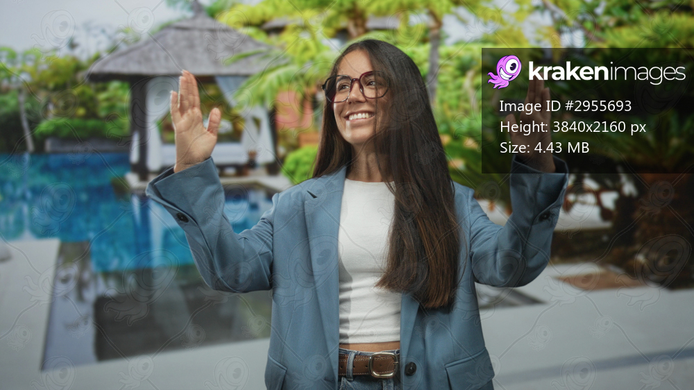 Woman wearing glasses raises hands palms visible and smiles performing a waving gesture in a studio; joy greeting.