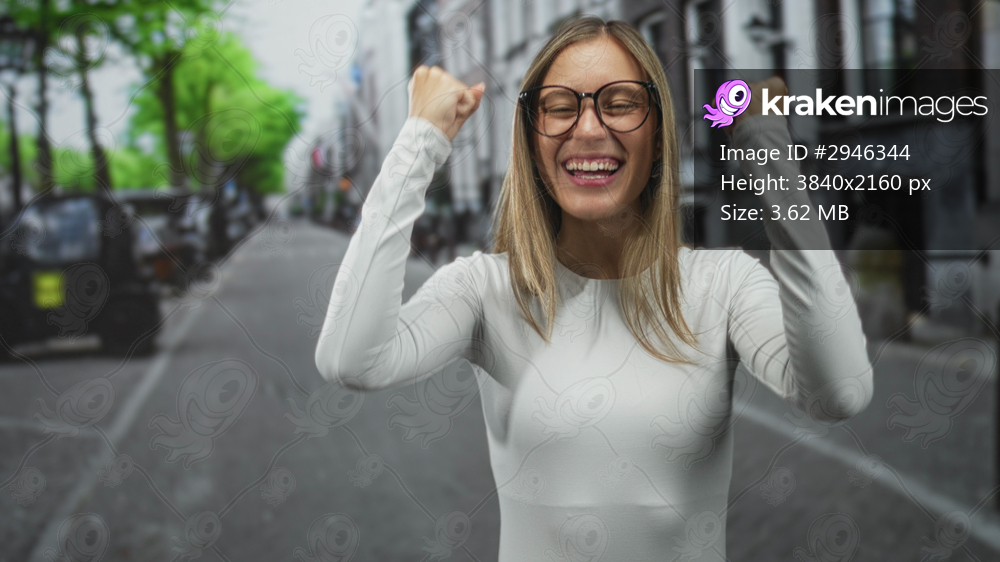 Woman wearing glasses raising both fists in a victory gesture on a cobbled street with buildings and parked cars; joy celebration triumph.