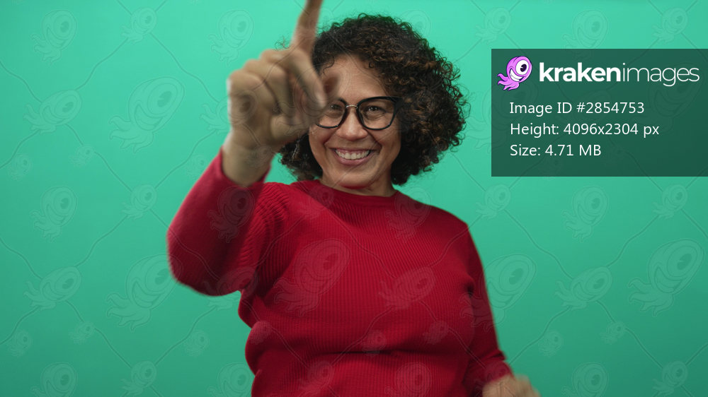 Woman wearing glasses and red sweater pointing finger and flashing victory sign in green studio; joy.