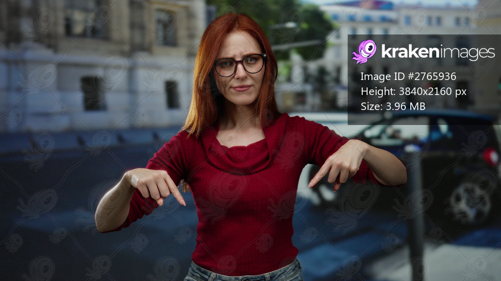 Woman wearing glasses and red sweater stands on a city street striking a pose, showcasing her red hair against an outdoor urban backdrop.