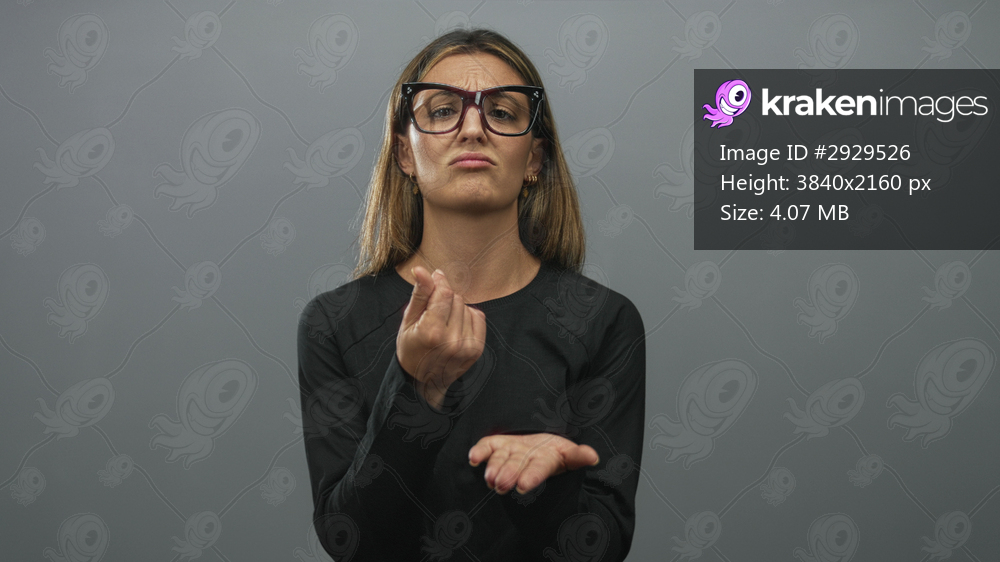 Woman wearing glasses rubbing fingers and pointing to open palm in studio with grey backdrop; pleading help.