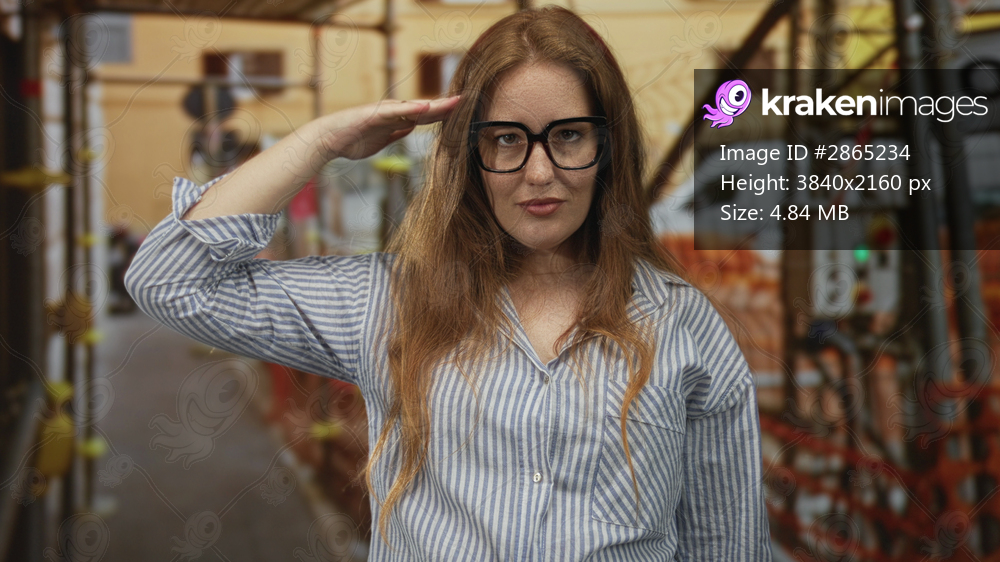 Woman wearing glasses salutes beside a building at a daytime construction site framed by scaffolding and metal pipes; respect duty.
