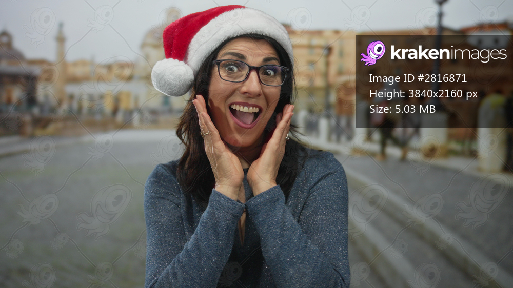 Woman wearing glasses and santa hat smiles with arms crossed while standing at roman ruins building; joy.