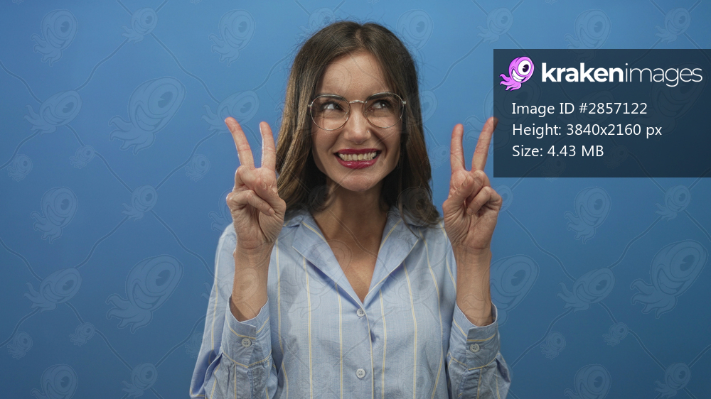 Woman wearing glasses showing peace sign with hand against a blue studio wall while smiling; optimism.