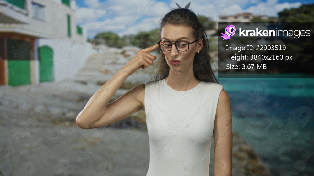 Woman wearing glasses and sleeveless white top, finger to temple and puckered lips, standing by seaside building and rocky coastline; curious reflection. - Kraken Images