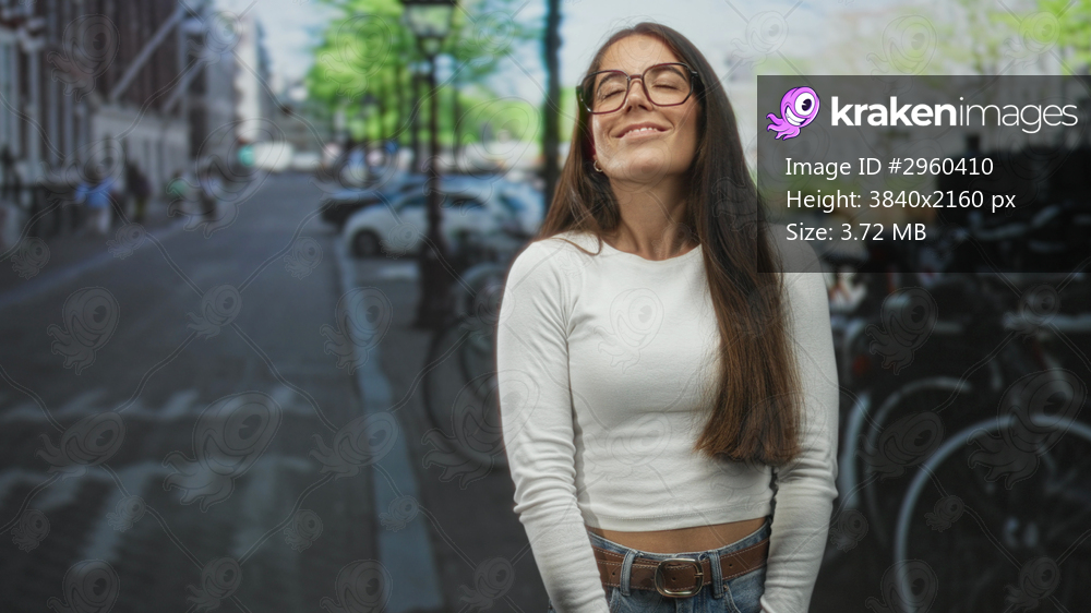 Woman wearing glasses smiles with eyes closed and hands loosely clasped at waist on a street beside parked bikes and cars; quiet contentment.