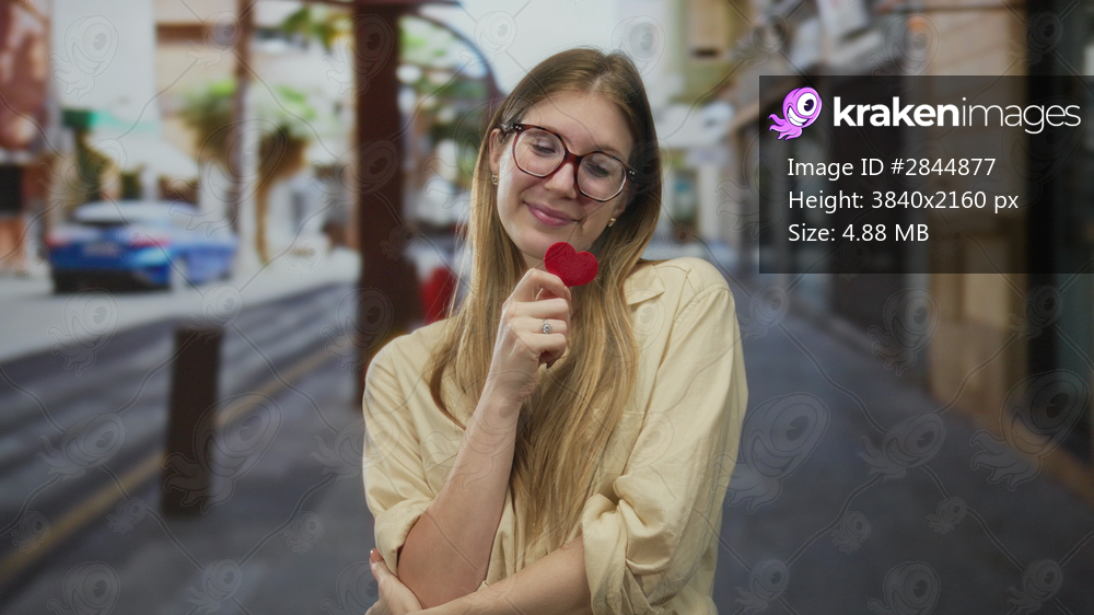 Woman wearing glasses smiles and holds red heart card with both hands on sunny city street at midday; love joy.