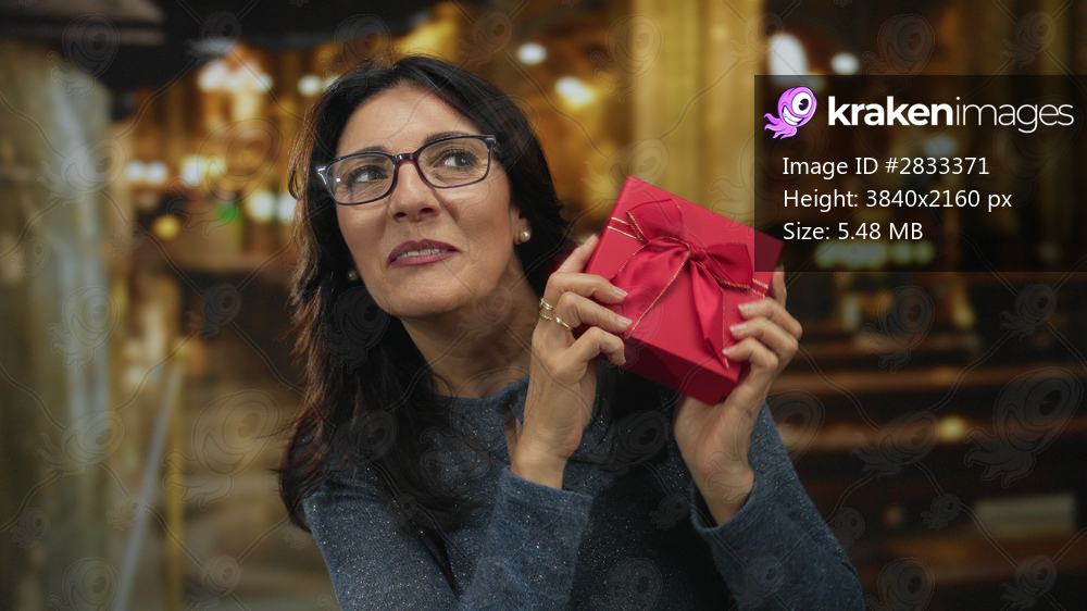 Woman wearing glasses smiling and holding red gift box with hands in church building; gratitude faith joy hope.