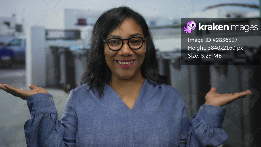 Woman wearing glasses smiling holds open palms beside a row of trash containers on a busy city street; doubt.