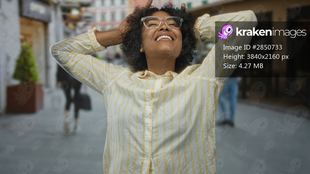Woman wearing glasses smiling and making peace sign on busy city street in daylight; playfulness joy.