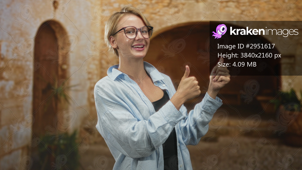 Woman wearing glasses smiling and making thumbs up with both hands and open palms in a sunlit stone building courtyard; encouragement joy.