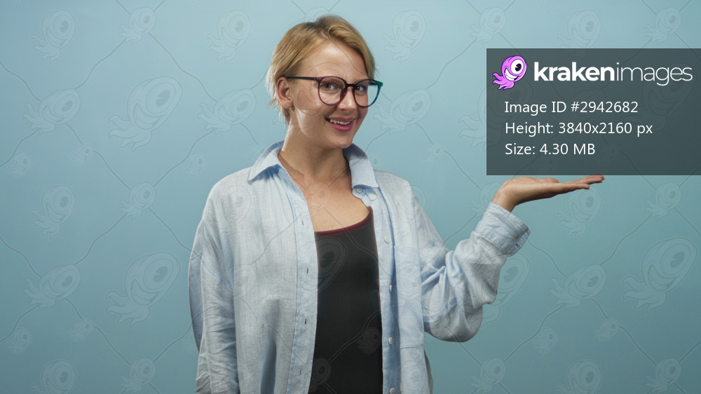 Woman wearing glasses smiling, palm up presenting with open hand and slight head tilt against blue studio backdrop; welcoming confidence.