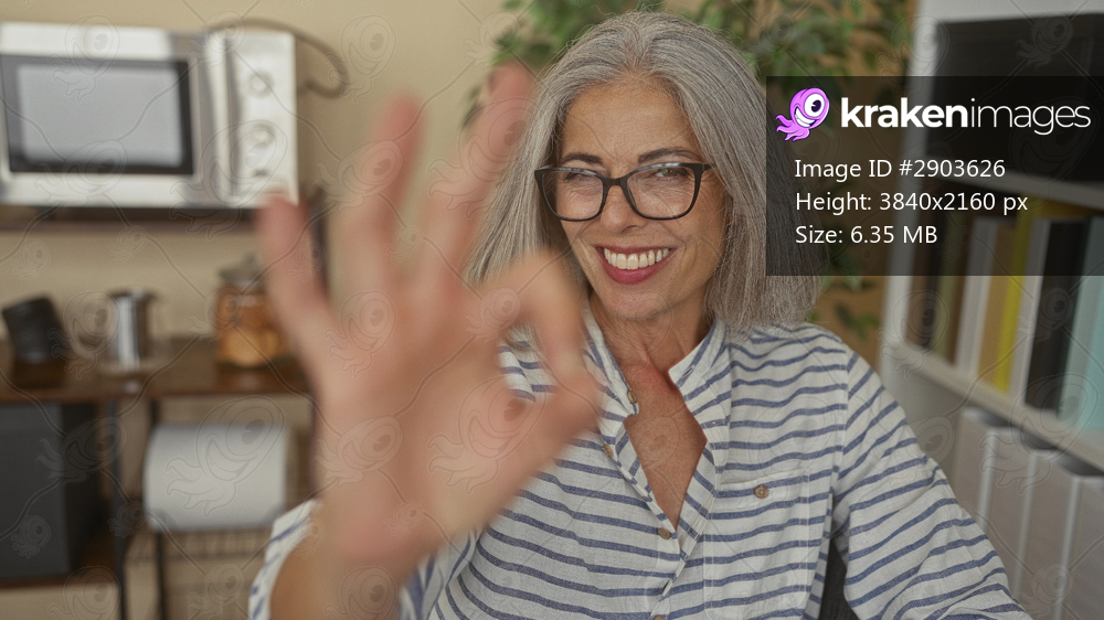 Woman wearing glasses smiling and showing ok sign with hand close to camera in office building bookshelf setting; confidence approval friendliness.
