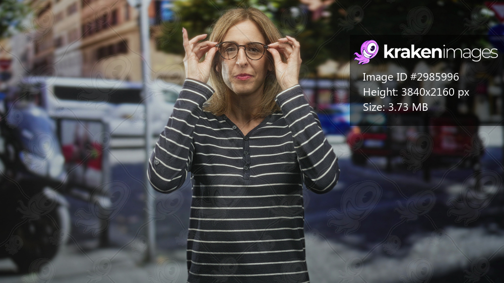 Woman wearing glasses smiling, standing with hands relaxed in a striped henley sweater on an urban street with vehicles and buildings; cheerful confidence. - Kraken Images