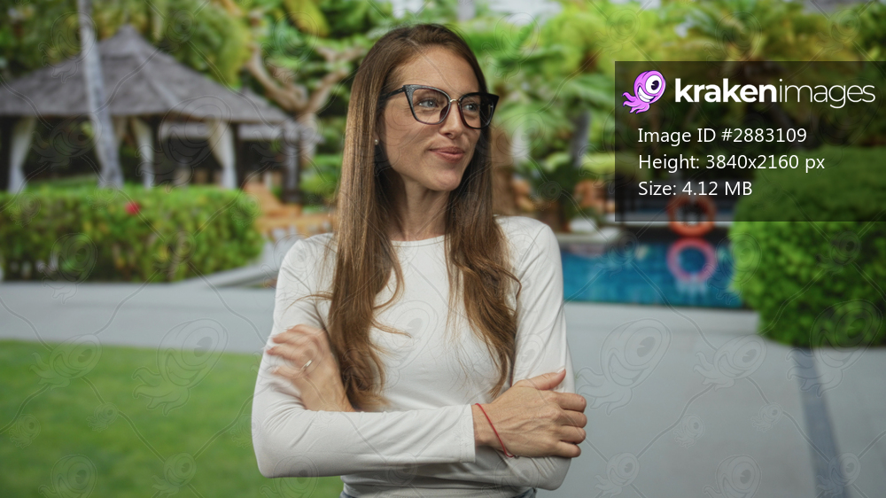 Woman wearing glasses smiling with thumbs up and arms crossed near hotel pool at resort building; warm confidence.
