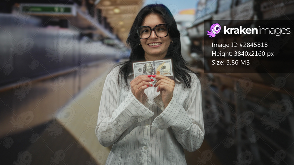 Woman wearing glasses and smiling while holding a hundred dollar bill inside building; optimism prosperity.