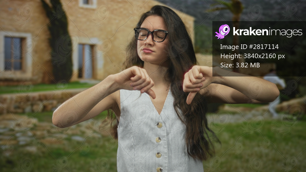 Woman wearing glasses standing at building entrance shows thumbs down gesture with bare arms and neutral expression; rejection.