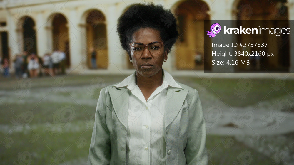 Woman wearing glasses standing indoors at an old university with arched architecture and blurred people in background suggests academic setting and scholarly environment. - Kraken Images