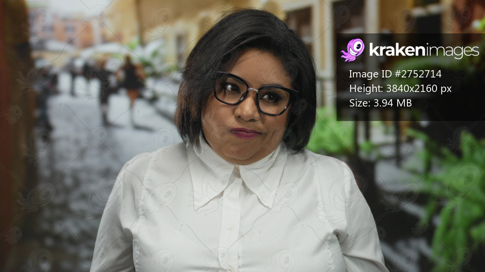 Woman wearing glasses standing outdoors on a city street, showcasing a confident latin appearance with short hair and a white shirt, surrounded by a blurred urban environment. - Kraken Images