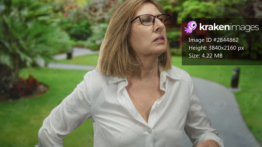 Woman wearing glasses standing touches chin in green park pathway lined with trees and lush shrubs; concern.