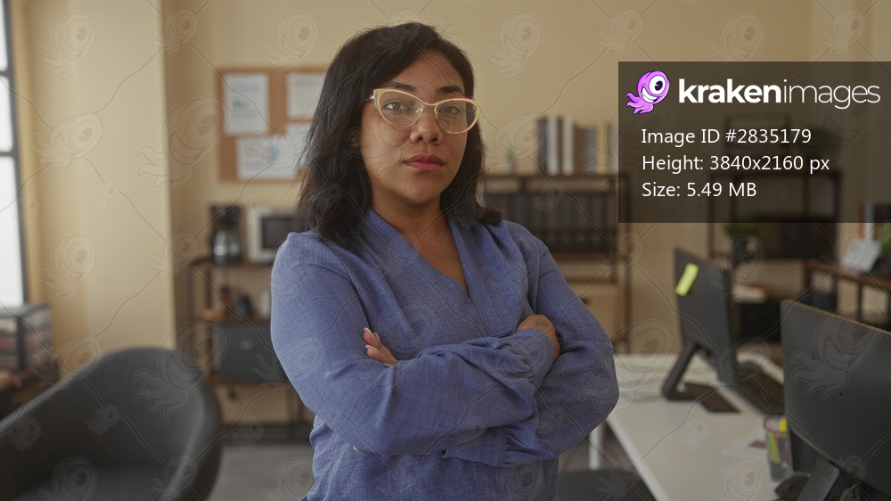 Woman wearing glasses stands with arms crossed in an office building; confidence.