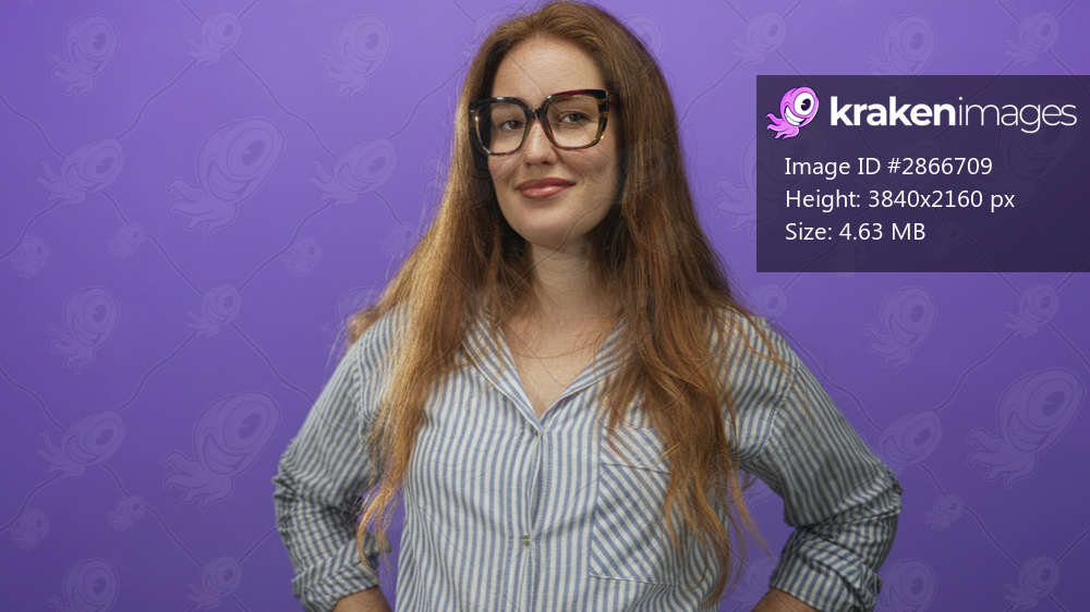 Woman wearing glasses stands hands on hips with subtle smile against purple studio wall; confidence.